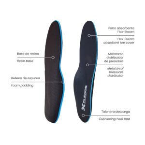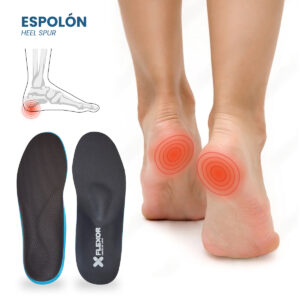 Plantillas moldeadas con talonera de descarga para espolón de calcáneo. Se compone de materiales de estructuración, elementos en látex blando (20-25º Asker C) y base antideslizante.
